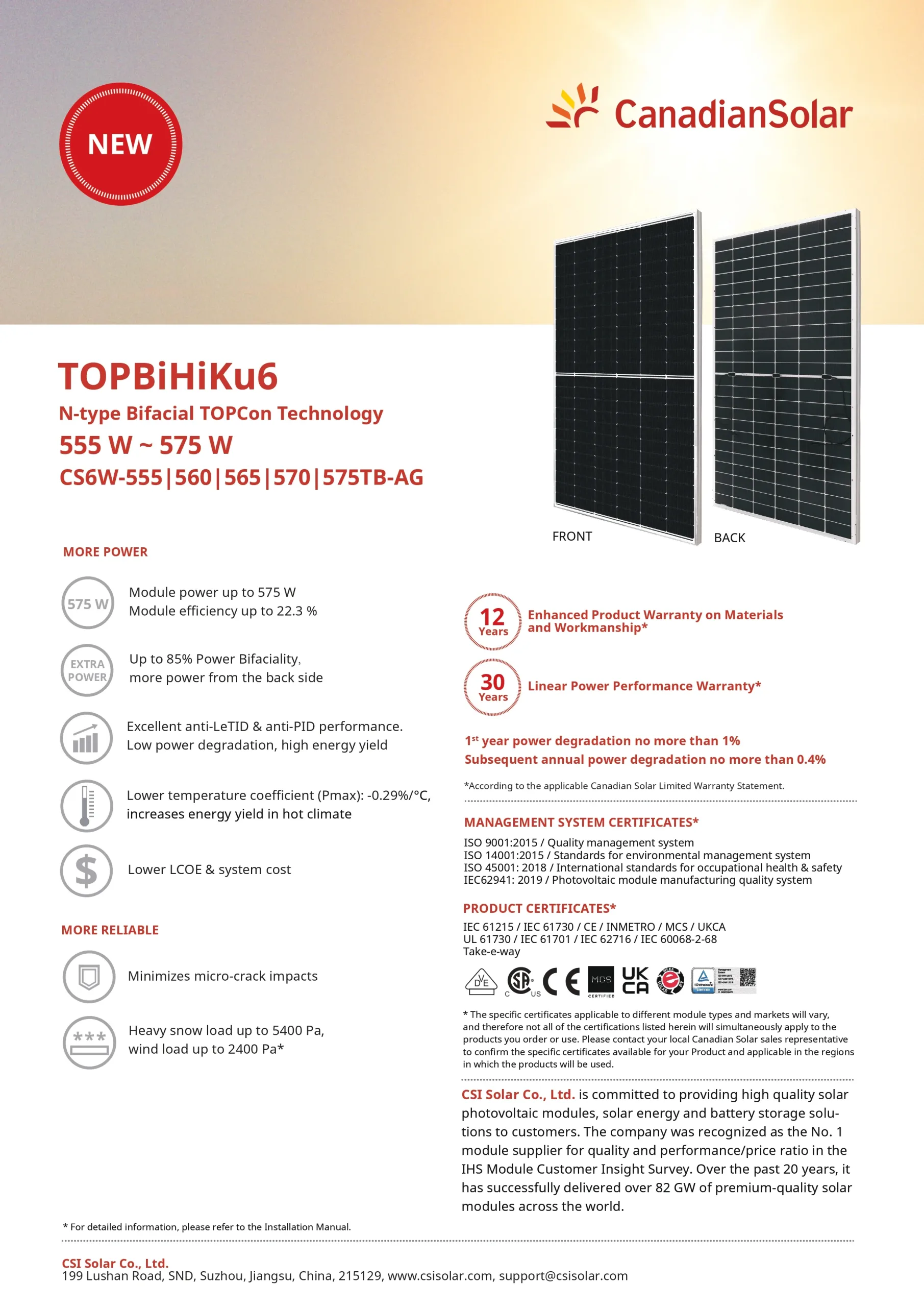 Panneau solaire Canadian Solar TOPBiHiKu6 BIFACIAL 575Wc